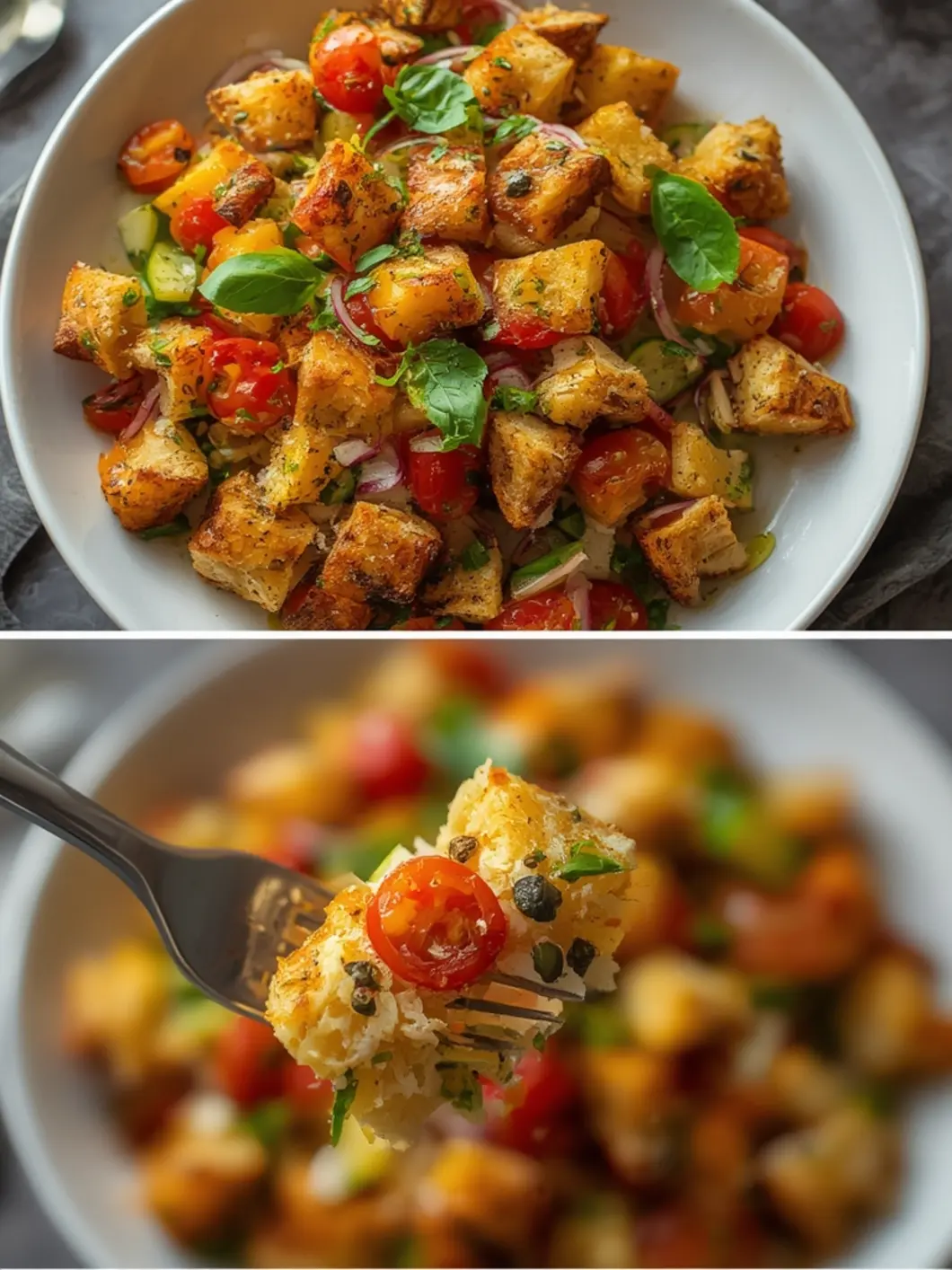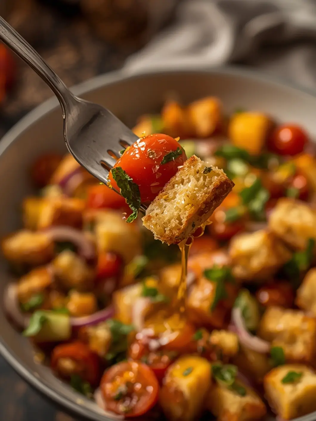This recipe delivers a satisfying crunch from the bread contrasted with the juicy burst of tomatoes. It hits all the right sensory notes without the heaviness of a creamy pasta salad.